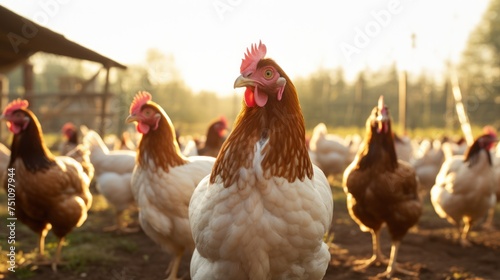 flock of Plymouth Rock bar hens are feeding in the pasture. There is a farm in the background.