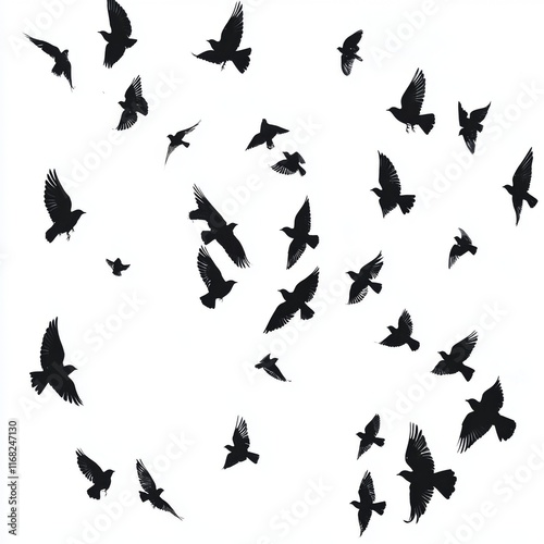 Flock of Silhouetted Birds in Flight Against a White Background, Artistic Representation of Nature and Freedom