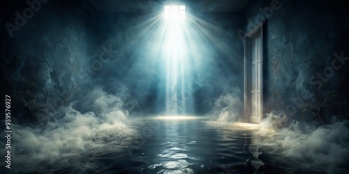 Flooded Basement with Light Rays and Fog, abandoned , mysterious , darkness , flooded basement