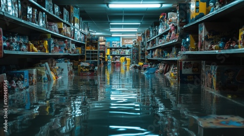 Flooded Toy Store Aisle with Water Reflection and Colorful Shelves