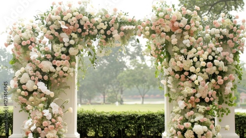Floral Archway Design with Soft Pink and White Blossoms Against a Lush Green Background for Wedding or Event Decoration Ideas