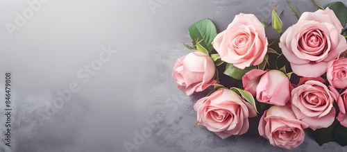 Floral background image with copy space featuring a bouquet of pink roses arranged in a floral frame perfect for Mothers Day The roses contrast beautifully against the bright gray background