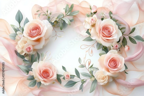 Floral Birthday Card Wreath Design with Roses and Leaves on Pink Marble Background with Gold Diamonds for Happy Birthday Wishes