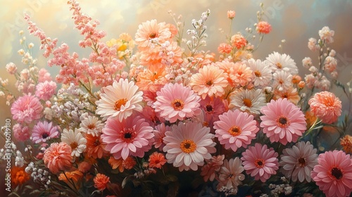 Floral bouquet in pastel hues. Soft light bathes a vibrant array of pink, peach, and orange blossoms
