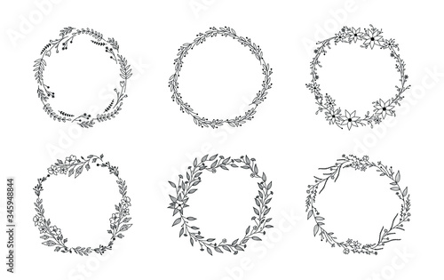 Floral circular frames and borders. Set of doodle hand drawn wreaths with flowers, leaves and plants. Vintage vector illustration