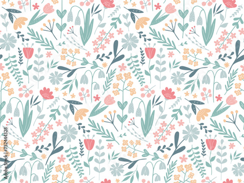 Floral colorful seamless Pattern. Hand drawn Flowers and branches in Scandinavian style. Cute Spring summer plants botanical Background. Flat design illustration for wallpaper, cover, fabric, banner