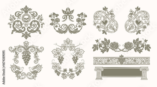 Floral decorative vector elements set, rococo and baroque style, vintage royal details. engraving illustration set