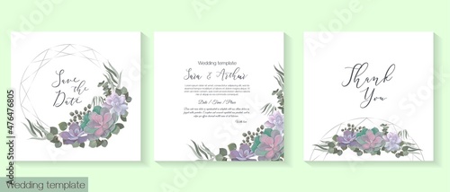 Floral design for wedding invitations. Succulents, eucalyptus, berry, dense greenery, green plants and leaves, polygonal frame. Vector template for a postcard.Invitation card, thanks.