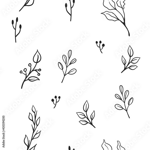 Floral doodle elements seamless texture. Hand drawn decorative leaves and wreaths texture background. Tree branches with leaf illustrations.