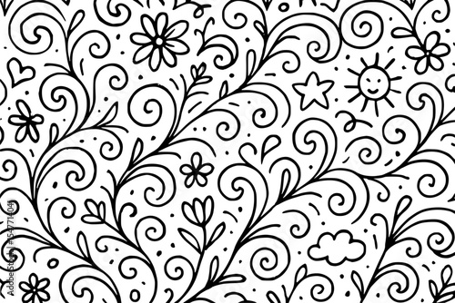 Floral doodle pattern with swirls, flowers, and sunshine elements