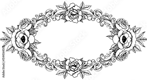 Floral Elegance: A meticulously crafted black-and-white floral frame, showcasing intricate botanical designs and a blank central space for personalized text.