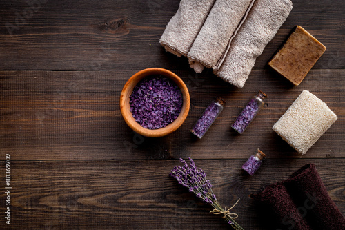 Floral foot spa with lavender. Spa salt, sponge, soap, towel on dark wooden background top view copyspace