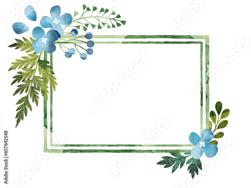Floral frame with blue hydrangea flowers, green leaves, berries and ferns. Floral illustration. Floral decoration for wedding, invitations, cards, wall art.