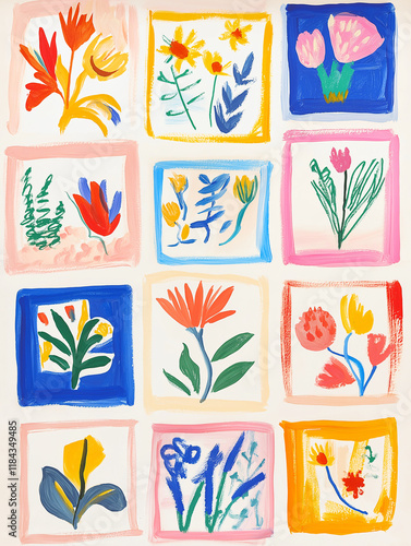 Floral Grid: A vibrant and playful pattern of hand-painted flowers in colorful frames, perfect for adding a touch of whimsy and nature to your designs.