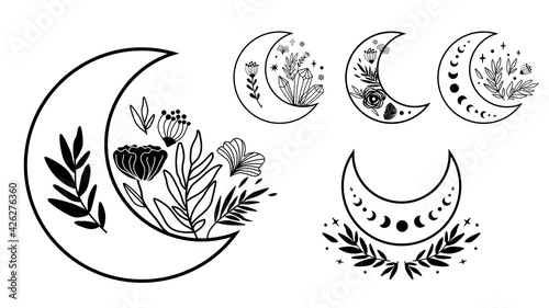 Floral moon clipart. Moon phase flowers set. Black moon elements. Celestial crescent flowers Hand drawing