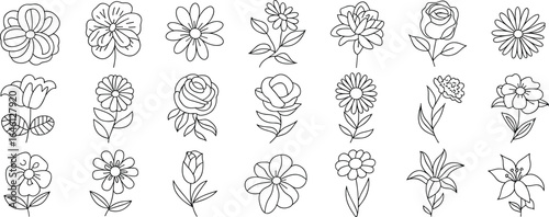 Floral Outline Icon Collection, Hand Drawn Flower Line Art Set, Botanical Doodle Vector Illustrations for Design, Nature and Spring Theme
