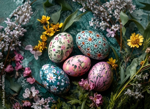 Floral Painted Easter Eggs with Spring Flowers on a Textured Surface