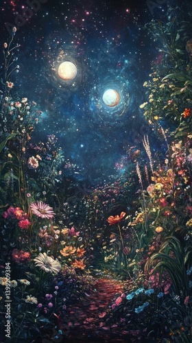 Floral Pathway under a Celestial Glow: A Night Garden Fantasy Illustration