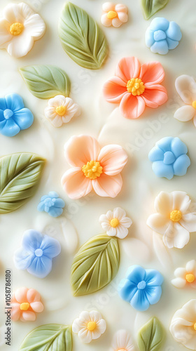 Floral pattern featuring delicate flowers made of polymer clay in pastel colors. Light background. Generative AI