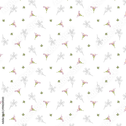 Floral pattern. Seamless pattern with wild wildflower pink flowers. Flower blossom. Illustration in sketch and color style. Doodle and line drawing. Summer design for textile, packaging, paper.