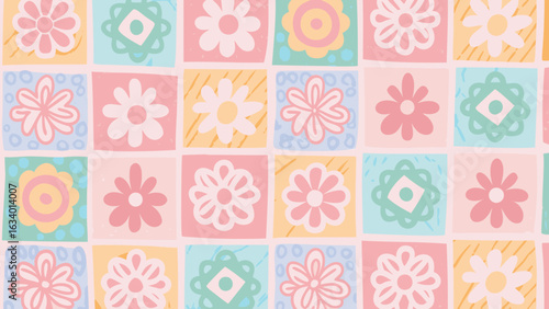 Floral pattern with pastel colors in square tiles featuring various flower designs and geometric shapes