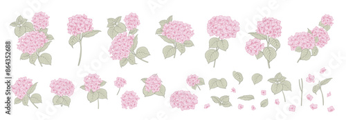 Floral pink Hydrangeas. Set of differents white hydrangea on white background. Elegant line art, outline illustration.