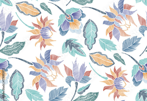 Floral seamless background pattern with fantasy flowers and leaves Line art. Embroidery flowers. Vector illustration.
