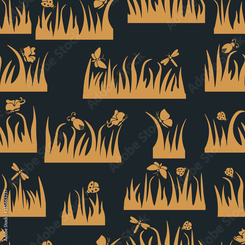 Floral seamless pattern, butterfly, beetle, dragonfly in the grass, insects