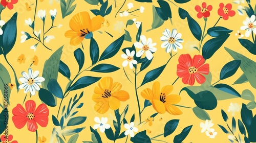 Floral seamless pattern featuring garden elements on a yellow backdrop