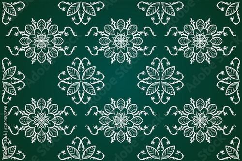 Floral seamless pattern hand drawn traditional ornament decoration mixed with victorian style. Geometry each side for fashion fabric, knit, textile, batic. Green background.