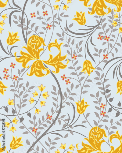 Floral seamless pattern with big yellow flowers, tulips and foliage on light background. Vector illustration.