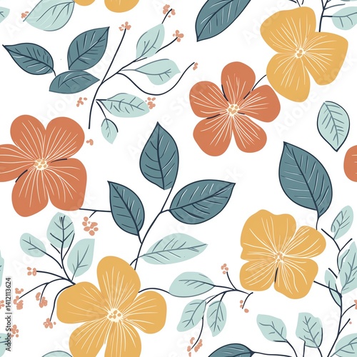 Floral Seamless Pattern with Orange and Yellow Flowers Green and Teal Leaves on a White Background Detailed Art