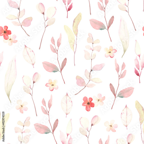 Floral seamless pattern with tender pink branches and flowers, watercolor illustration on white background.