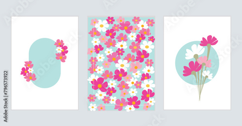Floral wedding invitation card template design, pastel color cosmos flowers with boho background