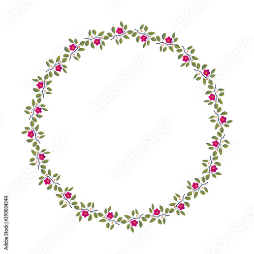 Floral wreath, branches with leaves and bright magenta flowers on white. Vector illustration, design for poster, banner, invitation, book, fashion fabric, wrapping.