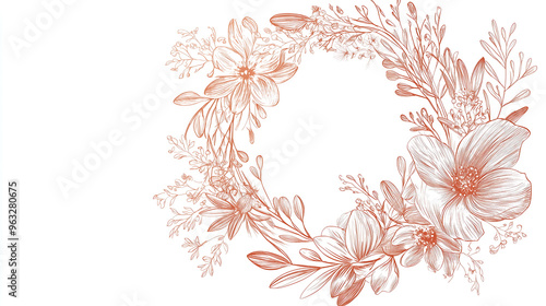 Floral wreath frame, line art vector illustration, white background, warm peach and brown color palette, clip art