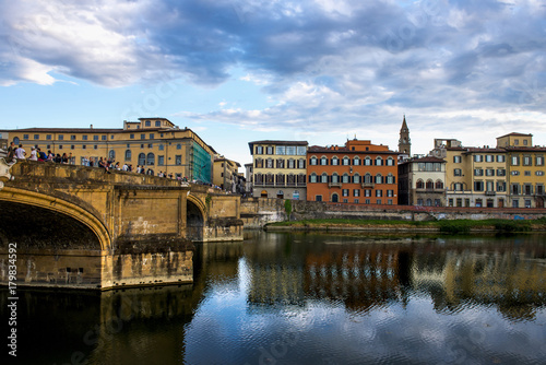 Florence cityscape view with Ponte Vecchio, a medieval stone bridge over Arno River.