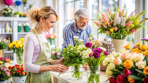Florists Creating Beautiful Bouquets. The scene captures the artistry and joy of floral design, showcasing the beauty of nature and skilled craftsmanship.