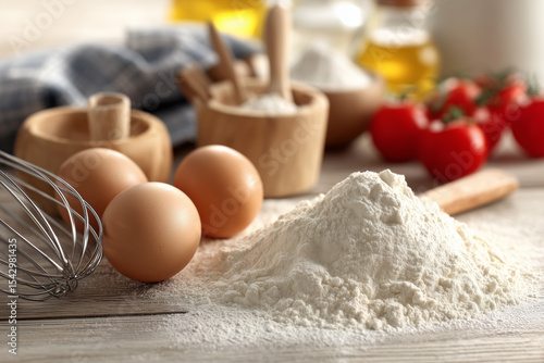 Flour and Baking Ingredients on Rustic Kitchen Table