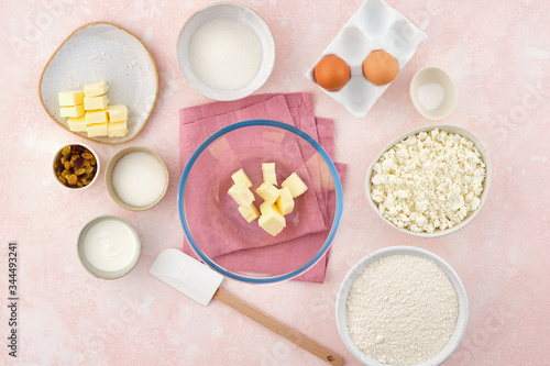 flour, cottage cheese in bowl and milk, eggs. products for making cheesecakes on a pink backround.