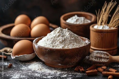 Flour, eggs, and baking tools arranged on rustic table evoke cozy baking atmosphere