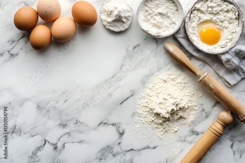 Flour, Eggs, and Rolling Pin on Kitchen Countertop