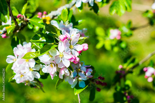Flourish pink apple flowers on branch in park
