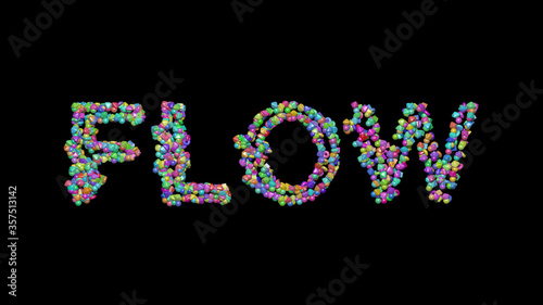 flow written in 3D illustration by colorful small objects casting shadow on a black background