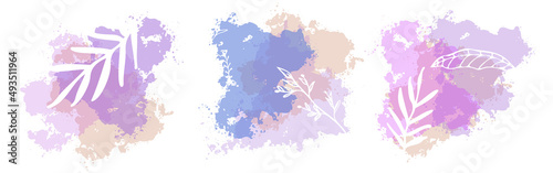 Flower branch and minimalistic plant set. Hand drawn lines, elegant leaves for your own design. Botanical, chic and trendy plants with watercolor splashes.
