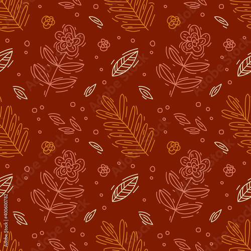 Flower doodle illustration with colored contours of plants and flowers. Seamless vector pattern for textile, decor, wallpaper