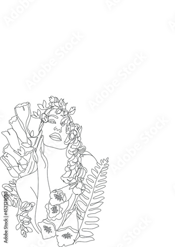 Flower face woman line drawing. Modern continuous line art. Women line art. Beauty salon logo. Coloring book. Botanical print. Nature symbol of cosmetics. Fashion logo.