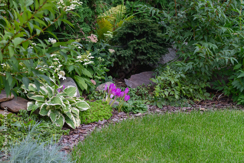 Flower garden with an Alpine rock slide among trees and shrubs in the Park.