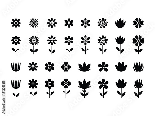 Flower Icon Set, Flat Floral Silhouette Vector Collection