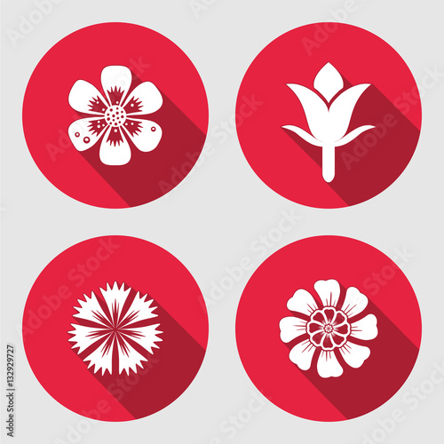 Flower icons set. Chamomile, daisy, blue poppy, cloves. Floral symbols. Round circle flat sign with long shadow. May be used in cuisine. Vector